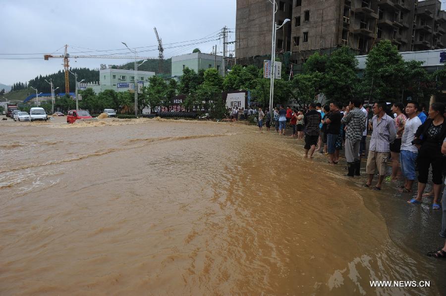 People stand on a waterlogged road in Pingba County of Anshun city, southwest China's Guizhou province, June 3, 2014. Heavy rain has battered most areas of Guizhou since Monday. (Xinhua/Ou Dongqu)