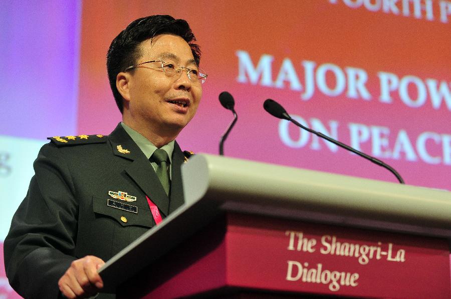 Wang Guanzhong, deputy chief of the General Staff of the Chinese People's Liberation Army, speaks during the fourth plenary session of the 13th Shangri-La Dialogue in Singapore June 1, 2014, the final day of the multilateral forum focusing on security issues in Asia. (Xinhua/Then Chih Wey)