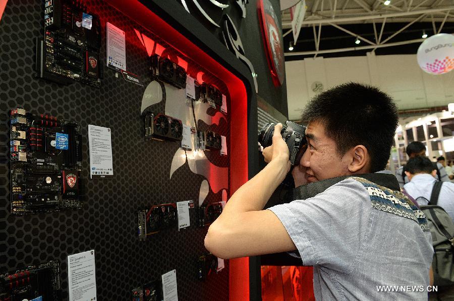 A visitor takes photos of chipsets and GPUs displayed at the 2014 COMPUTEX Taipei, an international information and communications technology (ICT) show, in Taipei, southeast China's Taiwan, June 3, 2014. COMPUTEX Taipei is the largest ICT show in Asia. This year's COMPUTEX Taipei, opening on Tuesday, attracted more than 1,700 exhibitors, with the estimated visitor number exceeding 130,000. Deal oppotunities of billions of U.S. dollars will also be expected during the five-day event. (Xinhua/He Junchang) |