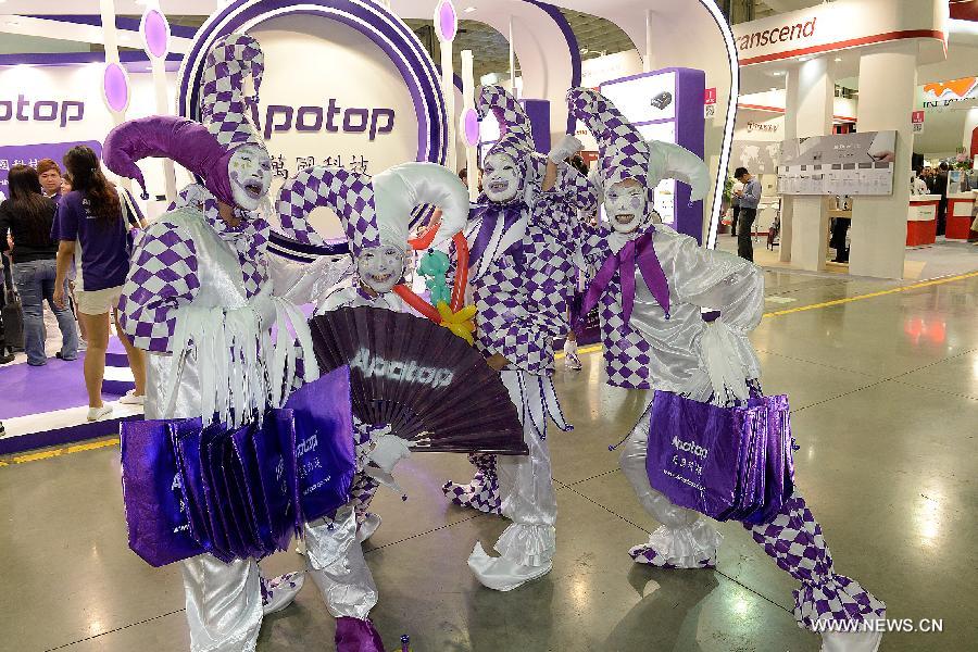 Clowns stage a promotive performance at the 2014 COMPUTEX Taipei, an international information and communications technology (ICT) show, in Taipei, southeast China's Taiwan, June 3, 2014. COMPUTEX Taipei is the largest ICT show in Asia. This year's COMPUTEX Taipei, opening on Tuesday, attracted more than 1,700 exhibitors, with the estimated visitor number exceeding 130,000. Deal oppotunities of billions of U.S. dollars will also be expected during the five-day event. (Xinhua/He Junchang) |