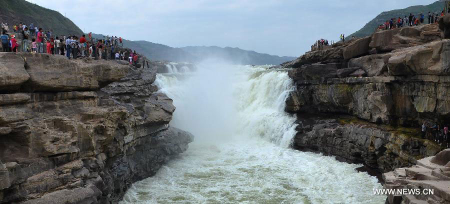 As the warm weather has picked up recently, a surge of water has fattened the roaring downpour at Hukou Falls, which sits on the Yellow River at the junction between Yichuan county, Shaanxi province, and Ji county, Shanxi province. At this point, the Yellow River's waters dash down in torrents, wetting the throngs of visitors that come to see the falls in clouds of mist. (Photo/Xinhua) |