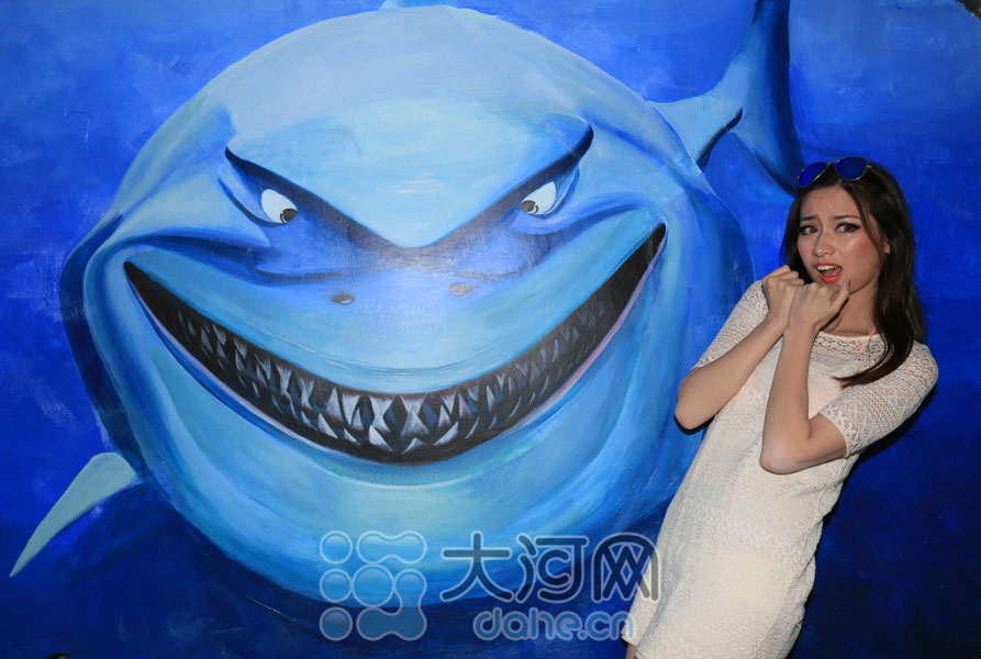 A model dances with sea life paintings on both sides of a corridor leading to the entrance and exit of a garage in Zhengzhou, capital of central China's Henan Province on Monday, June 2, 2014. The new garage is the first such building featuring 3D-designs of vivid images of sharks, whales and sea tortoises. [Photo: dahe.cn]