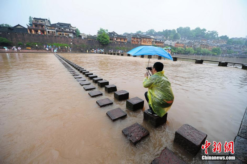 A scenic spot nearly submerged by river water in the Fenghuang Ancient Town, a famous tourist site in central China's Hunan province, attracts many visitors and photographers to the area on June 2, 2014. Recently, continuous rain has created a surge in river-water levels. [Photo: Chinanews.cn/Yang Huafeng] |