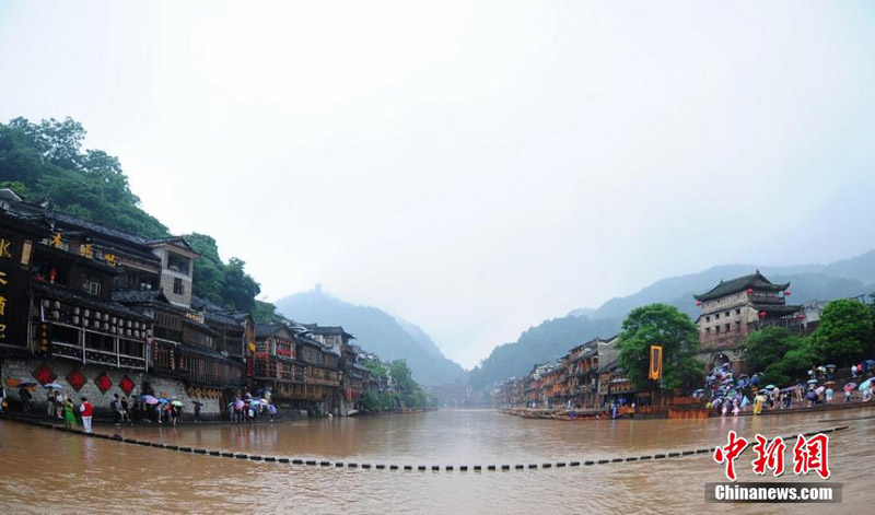 A scenic spot nearly submerged by river water in the Fenghuang Ancient Town, a famous tourist site in central China's Hunan province, attracts many visitors and photographers to the area on June 2, 2014. Recently, continuous rain in the area has caused the river's water-level to rise. [Photo: Chinanews.cn/Yang Huafeng] |