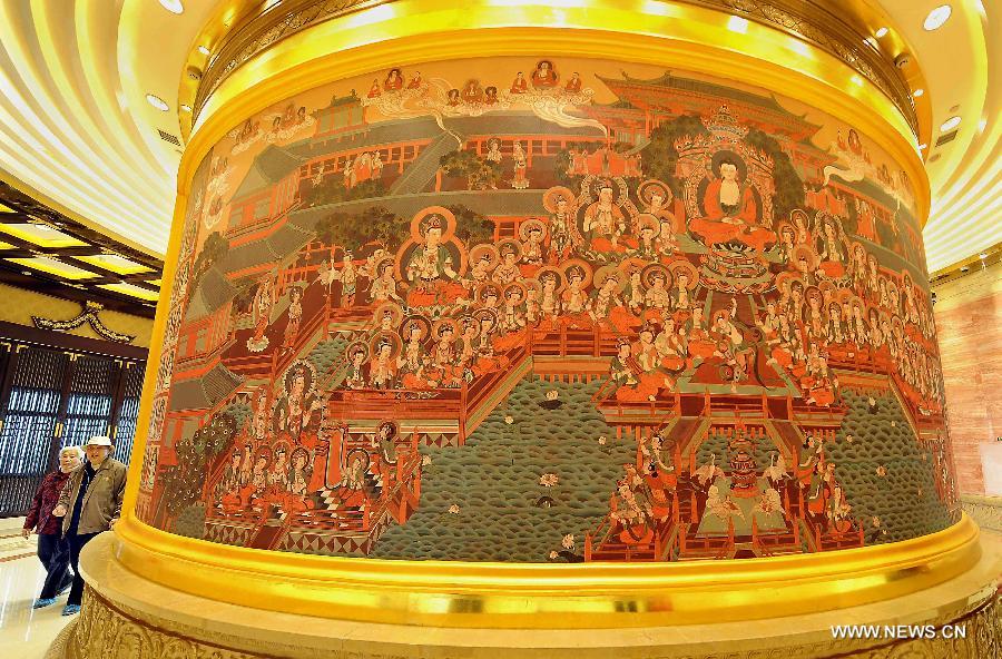 Tourists visit a lobby for respecting Buddhas at the Sui and Tang Dynasties Relic Garden in Luoyang, central China's Henan Province, April 7, 2013. Luoyang, one of the cradles of Chinese civilization and one of the "Four Great Ancient Capitals of China", tries to integrate its tourism spots, an effort to build a "Chinese Culture City."(Xinhua/Wang Song) |
