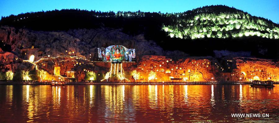 Night view is seen at the Longmen Grottoes in Luoyang, central China's Henan Province, April 13, 2012. Luoyang, one of the cradles of Chinese civilization and one of the "Four Great Ancient Capitals of China", tries to integrate its tourism spots, an effort to build a "Chinese Culture City."(Xinhua/Wang Song) |
