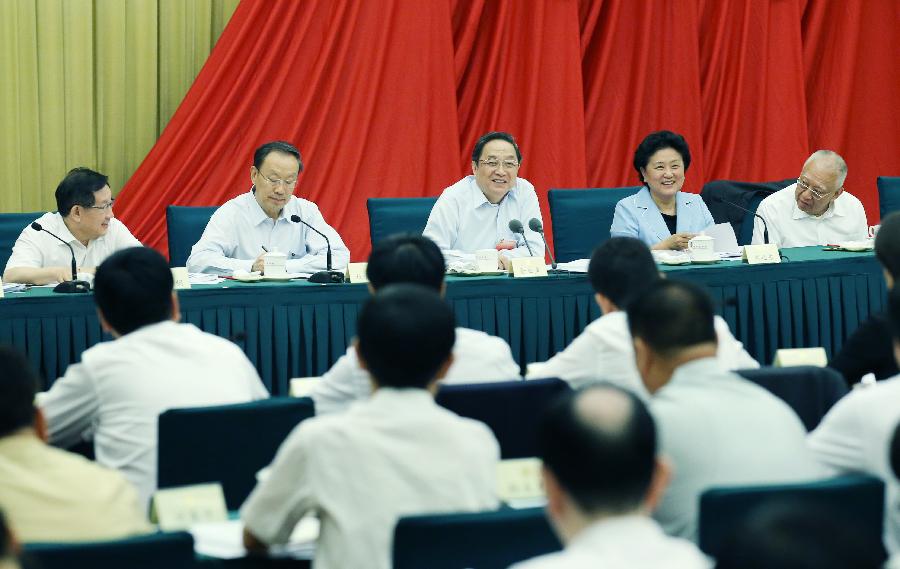 Yu Zhengsheng (C, back), a member of the Standing Committee of the Political Bureau of the Communist Party of China (CPC) Central Committee and chairman of the National Committee of the Chinese People's Political Consultative Conference (CPPCC), attends a meeting held by the CPPCC National Committee on deploying a modern vocational education program in Beijing, capital of China, June 3, 2014. (Xinhua/Yao Dawei) |