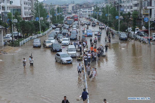 Downpours also hit Fengshan County in south China's Guangxi Zhuang Autonomous Region on Tuesday evening. Many roads were cut off and local schools were forced to close by floods, according to the county's publicity department.