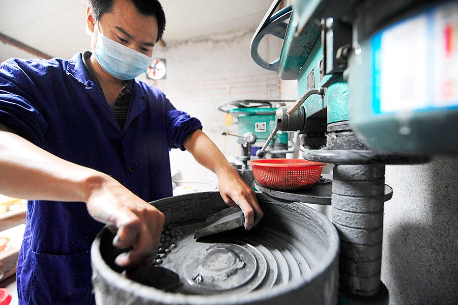 A craftsman polishes a piece of jade stone at a workshop in Baokang county, Hubei province.(Xinhua/ Hao Tongqian)