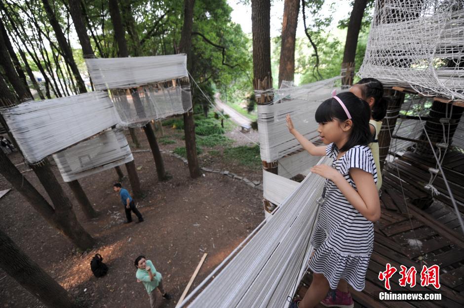 A unique tree house was unveiled in the grove besides the Architecture and Urban Planning School of Huazhong University of Science and Technology in Wuhan, capital of central China's Hubei province on June 3, 2014. The canopy of trees is the roof, and the wall is made of nylon rope. Between the gaps of the trunks, a dozen of wooden platform were set up, constituting several rooms. With the highest room 8 meters above the ground, the "built-up" area of the tree house is over 60 square meters. The design came from children's imagination. The construction took three months and over 40 kilometers of nylon rope and over 1,000 meters of steel wire were used. The tree house can bear the weight of 40 children. The trees are jacketed before the steel wires were bound. (Chinanews/Zhang Chang)