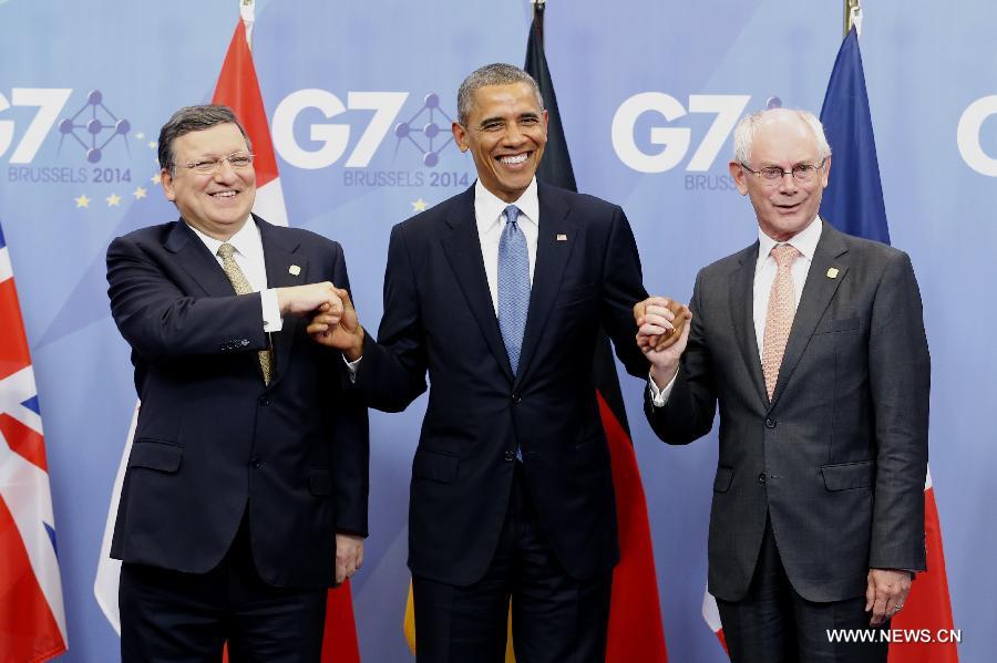 President of the European Commission Jose Manuel Barroso (L) and European Council President Herman Van Rompuy (R) welcome U.S. President Barack Obama (C) during the G7 summit in Brussels, Belgium, June 4, 2014. (Xinhua/The Council of the European Union) |