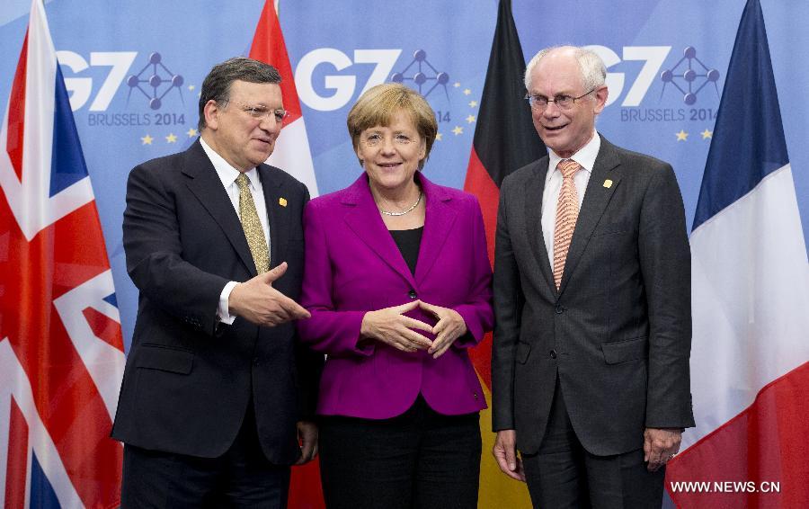 President of the European Commission Jose Manuel Barroso (L) and European Council President Herman Van Rompuy (R) welcome German Chancellor Angela Merkel (C) during the G7 summit in Brussels, Belgium, June 4, 2014. (Xinhua/The Council of the European Union) |