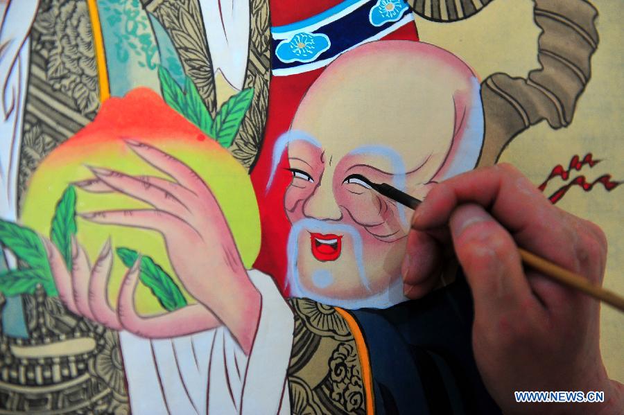 Shi Jianting, the sixth generation successor of Gaomi ash-patting new year painting, works on a painting at a studio in Gaomi, east China's Shandong Province, June 1, 2014. Gaomi ash-patting new year painting is a traditional art craft which has enjoyed a history of over 500 years and only existed in Gaomi. It has been included in the list of national intangible cultural heritages. (Xinhua/Guo Xulei) |