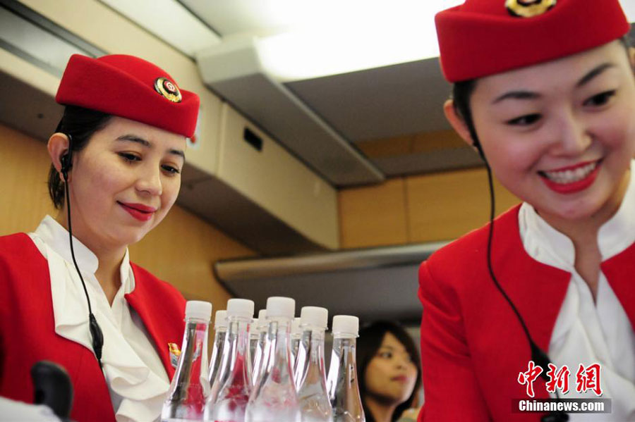 Train conductors of Uyghur descent give bottles of water during a trial run of a high-speed train linking the northwest Chinese provincial capital cities of Lanzhou, in Gansu province, and Urumqi, in the Xinjiang Uyghur Autonomous Region, on Jun 3, 2014. The 1,776km-long railway is expected to begin operations at the end of the year. This will also be the first high-speed railway in Xinjiang. [Photo: Chinanews.com] |