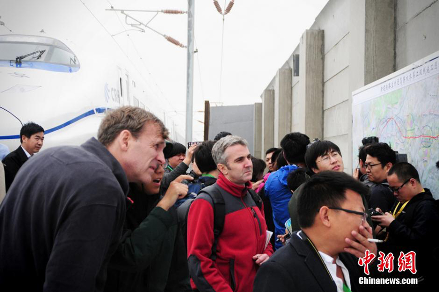 Chinese and foreign journalists come along for the ride during the trial run of high-speed train linking the northwest Chinese provincial capital cities of Lanzhou, in Gansu province, and Urumqi, in the Xinjiang Uyghur Autonomous Region, on Jun 3, 2014. The 1,776km-long railway is expected to begin operations at the end of the year. This will also be the first high-speed railway in Xinjiang. [Photo: Chinanews.com] |