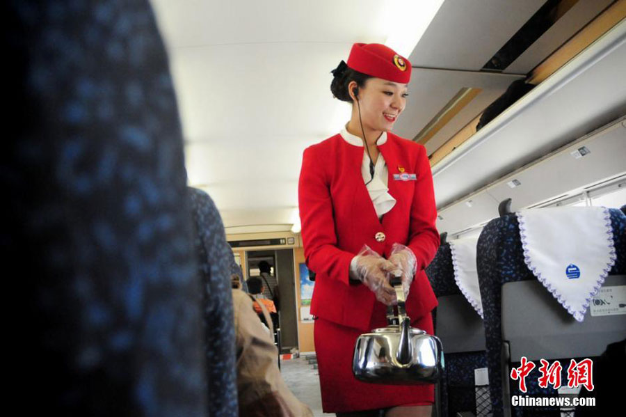 A train conductor of Uyghur descent gives water during a trial run of a high-speed train linking the northwest Chinese provincial capital cities of Lanzhou, in Gansu province, and Urumqi, in the Xinjiang Uyghur Autonomous Region, on Jun 3, 2014. The 1,776km-long railway is expected to begin operations at the end of the year. This will also be the first high-speed railway in Xinjiang. [Photo: Chinanews.com] |