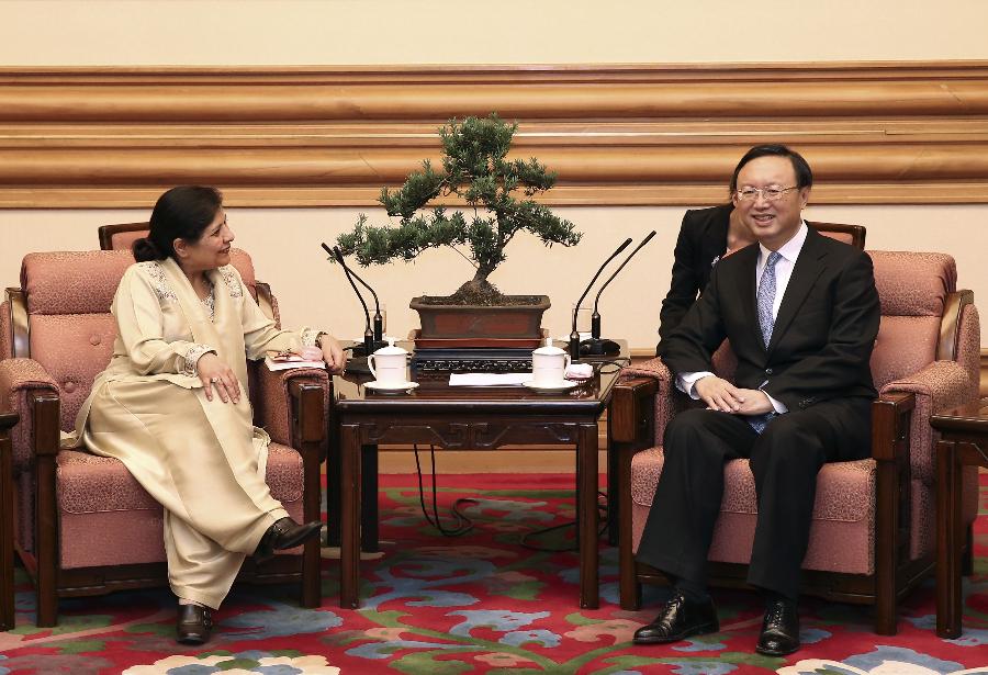 Chinese State Councilor Yang Jiechi (R) meets with UN Economic and Social Commission for Asia and the Pacific(ESCAP) Executive Secretary Shamshad Akhtar in Beijing, capital of China, June 4, 2014. (Xinhua/Pang Xinglei) |