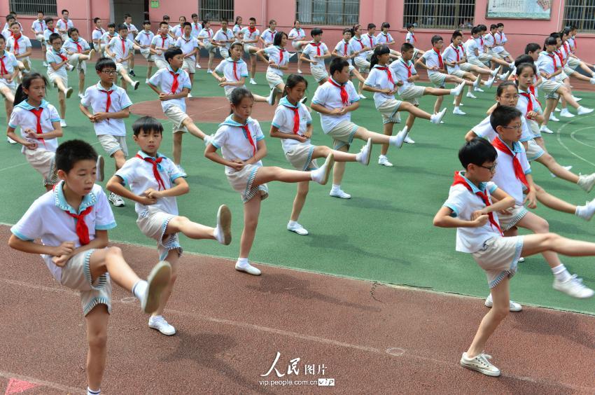 After over a month's practice, more than 1,100 students and teachers do the martial arts exercise "Rising Sun" for the first time in Choucheng Third Primary School in Yiwu, east China's Zhejiang Province, June 4, 2014. Every gesture and motion was well performed by the students. Since June 4, this martial arts exercise would be the class-break exercise of the school. According to Gong Jinta, the martial arts coach, the exercise is a combination of long boxing, Southern style boxing and other martial arts styles and it is popular among students due to its traditional features. (vip.people.com.cn/Lv Bin)
