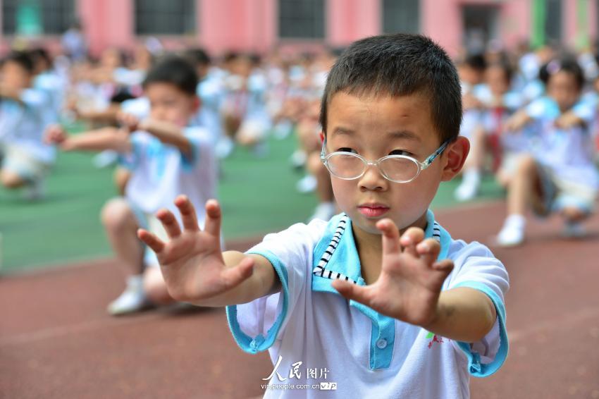After over a month's practice, more than 1,100 students and teachers do the martial arts exercise "Rising Sun" for the first time in Choucheng Third Primary School in Yiwu, east China's Zhejiang Province, June 4, 2014. Every gesture and motion was well performed by the students. Since June 4, this martial arts exercise would be the class-break exercise of the school. According to Gong Jinta, the martial arts coach, the exercise is a combination of long boxing, Southern style boxing and other martial arts styles and it is popular among students due to its traditional features. (vip.people.com.cn/Lv Bin)