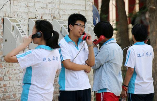 Students at Hengshui High School call their families on Tuesday, four days before the exam. (Photo/China Daily)