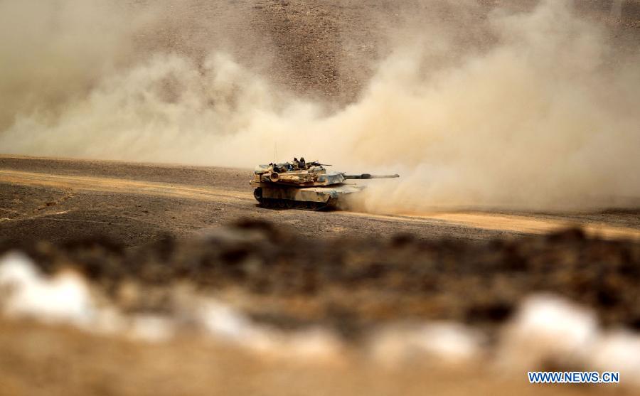 A tank is seen during the "Eager Lion" military drill at the Gulf of Aqaba, some 330 kilometers south of Amman, Jordan, June 5, 2014. The Jordan-hosted "Eager Lion" international military drill with the participation of 22 countries seeks to strengthen the skills of the Jordanian army and enhance cooperation, the army said.(Xinhua/Mohammad Abu Ghosh) |