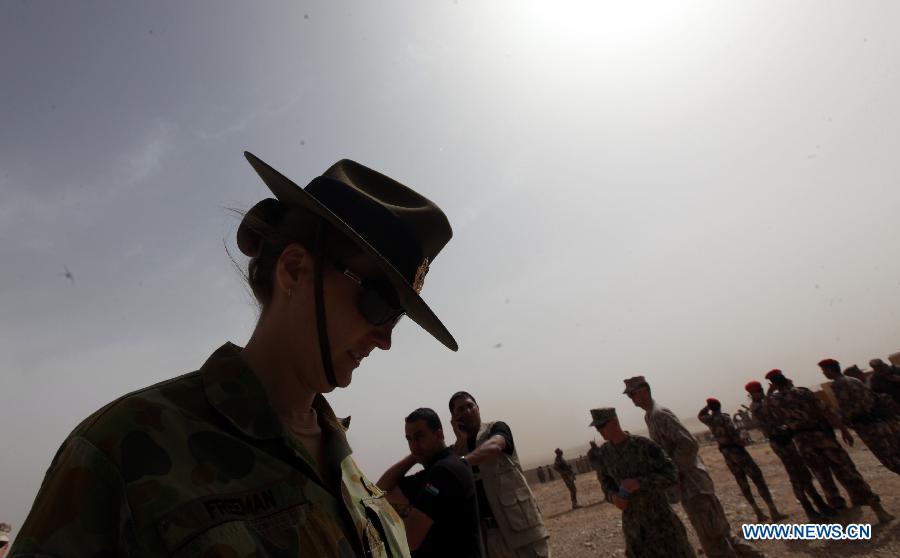 An Australian soldier takes a break during the "Eager Lion" military drill at the Gulf of Aqaba, some 330 kilometers south of Amman, Jordan, June 5, 2014. The Jordan-hosted "Eager Lion" international military drill with the participation of 22 countries seeks to strengthen the skills of the Jordanian army and enhance cooperation, the army said.(Xinhua/Mohammad Abu Ghosh) |