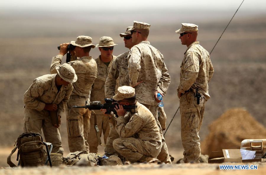 US soldiers watch tanks during the "Eager Lion" military drill at the Gulf of Aqaba, some 330 kilometers south of Amman, Jordan, June 5, 2014. The Jordan-hosted "Eager Lion" international military drill with the participation of 22 countries seeks to strengthen the skills of the Jordanian army and enhance cooperation, the army said.(Xinhua/Mohammad Abu Ghosh) |