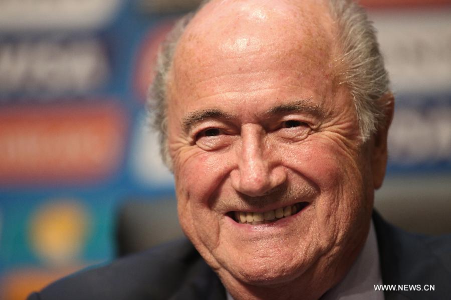 FIFA's president Joseph Blatter smiles during a press conference following a meeting of the FIFA Organising Committee for the World Cup 2014 in Sao Paulo, Brazil, on June 5, 2014. Sao Paulo will host the opening match of the World Cup on June 12. (Xinhua/Rahel Patrasso) |