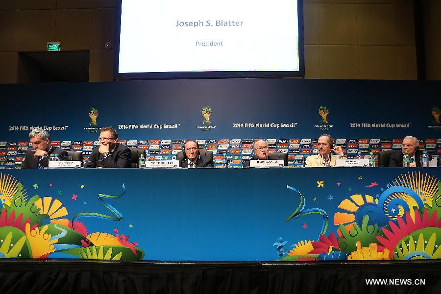 FIFA's president Joseph Blatter (3rd R) attends a press conference following a meeting of the FIFA Organising Committee for the World Cup 2014 in Sao Paulo, Brazil, on June 5, 2014. Sao Paulo will host the opening match of the World Cup on June 12. (Xinhua/Rahel Patrasso) |