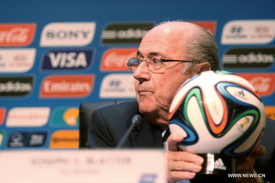 FIFA's president Joseph Blatter holds the FIFA World Cup official soccer ball during a press conference following a meeting of the FIFA Organising Committee for the World Cup 2014 in Sao Paulo, Brazil, on June 5, 2014. Sao Paulo will host the opening match of the World Cup on June 12. (Xinhua/Rahel Patrasso) |