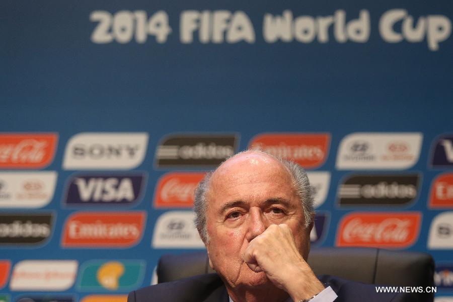 FIFA's president Joseph Blatter attends a press conference following a meeting of the FIFA Organising Committee for the World Cup 2014 in Sao Paulo, Brazil, on June 5, 2014. Sao Paulo will host the opening match of the World Cup on June 12. (Xinhua/Rahel Patrasso) |