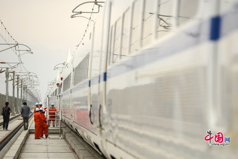 A CRH train makes a routine stop for a system integration checkup at a windy area near Dabancheng City, southeast of Urumqi, in China's northwest Xinjiang Uygur Autonomous Region. [Photo by Chen Boyuan / China.org.cn]