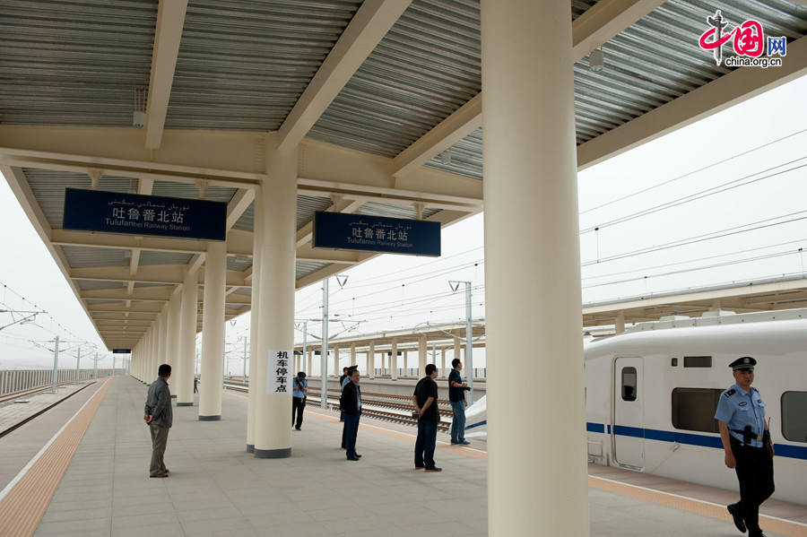 A CRH train stops at Tulufan North Station for an overall system examination after completing the first half of a system integration test run It will return to its base in Urumqi, the capital of Xinjiang Uygur Autonomous Region. [Photo by Chen Boyuan / China.org.cn] |