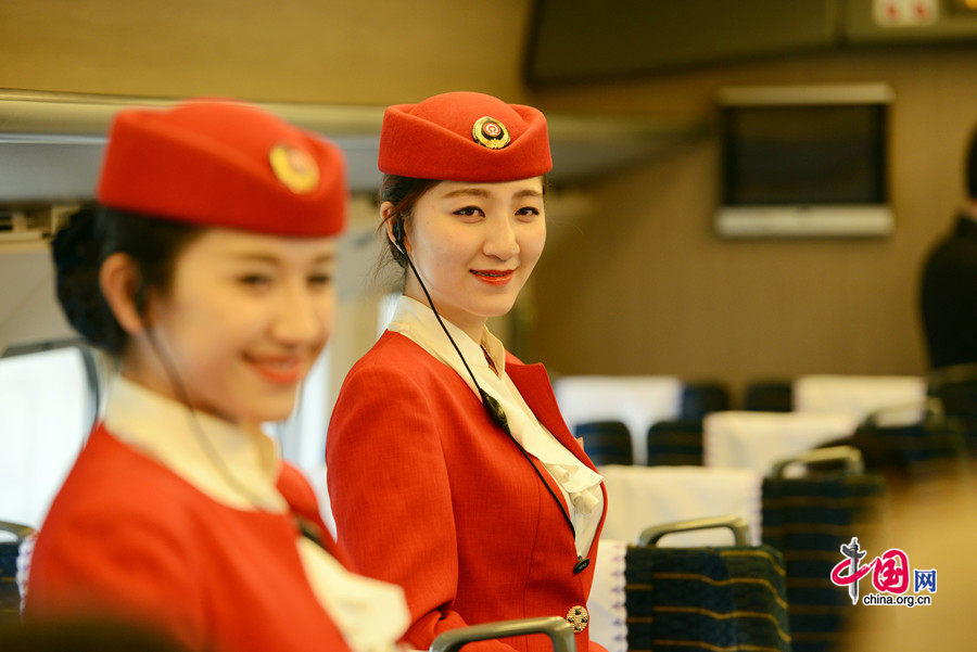 Bullet train attendants appear during an integrated test run of the Xinjiang-Lanzhou high-speed railway on Tuesday. The attendants for this railway are from multiple ethnic groups, primarily Han and Uygur. The railway that links Urumqi, capital city of Xinjiang Uyghur Autonomous Region, and Lanzhou, provincial city of Gansu, both of which are in northwest China, will be operational by the end of the year, marking the first-ever high-speed rail in Xinjiang. [Photo by Chen Boyuan / China.org.cn] |