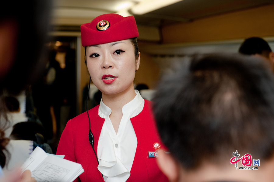 Bullet train attendants appear during an integrated test run of the Xinjiang-Lanzhou high-speed railway on Tuesday. The attendants for this railway are from multiple ethnic groups, primarily Han and Uygur. The railway that links Urumqi, capital city of Xinjiang Uyghur Autonomous Region, and Lanzhou, provincial city of Gansu, both of which are in northwest China, will be operational by the end of the year, marking the first-ever high-speed rail in Xinjiang. [Photo by Chen Boyuan / China.org.cn] |
