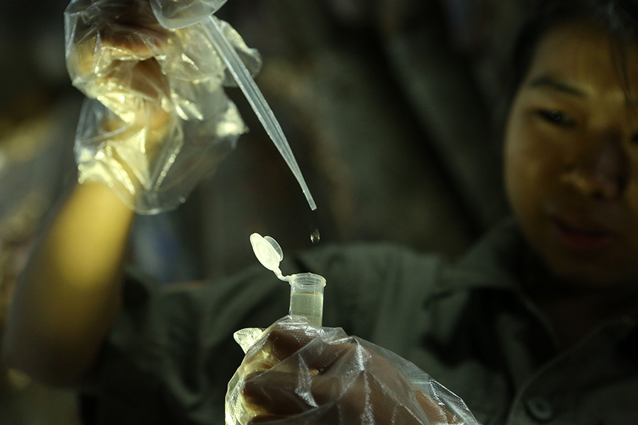 A technician takes samples of the condensation water for analysis on June 5, 2014. (Xinhua/Luo Guojia)