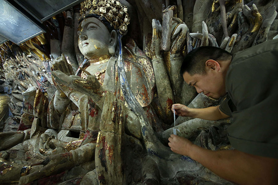 The rainy, hot and humid weather has severely hindered the repair of the Thousand-hand Bodhisattva in Dazu District, southwest China's Chongqing City. The condensation water has permeated into the stone and covered the whole statue, so the repair works, such as reinforcement, damages repair, colored painting, gilding, were all suspended. Now the technicians can only preliminarily clean the colored drawings.