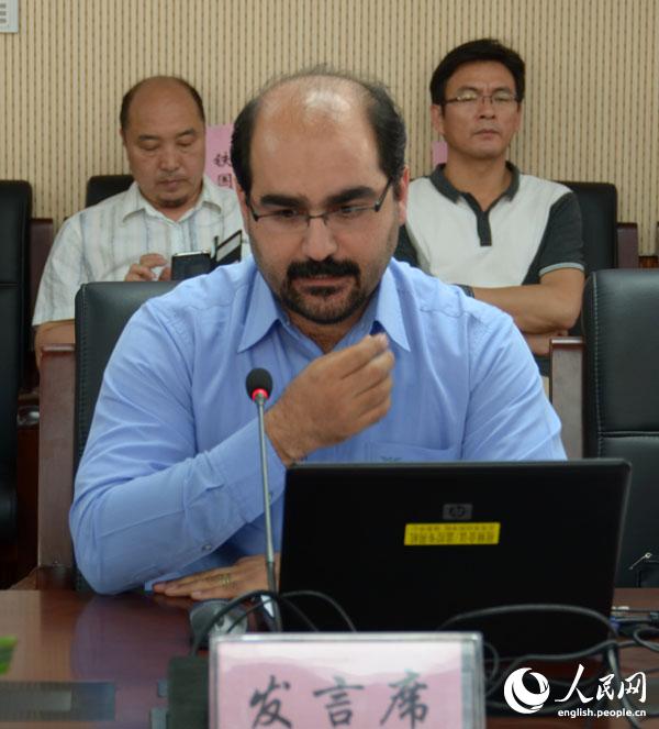 Massoud Shamaeizadeh, an Iranian entrepreneur in China, delivers a speech at the seminar in Beijing Huimin School, June 3, 2014. (People's Daily Online/Du Mingming)