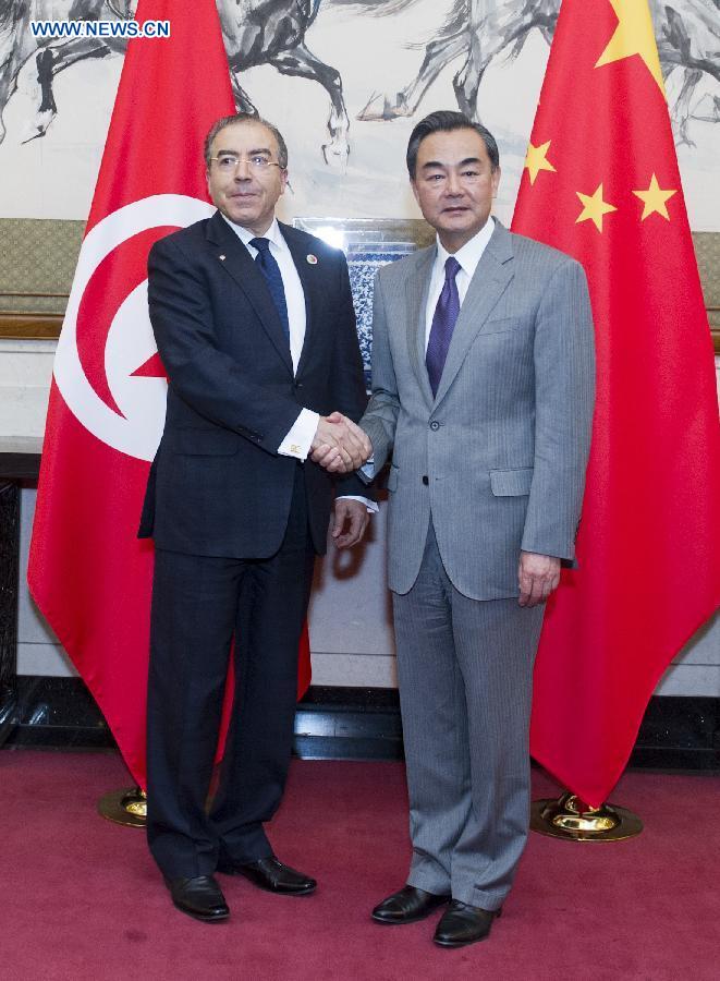 Chinese Foreign Minister Wang Yi (R) meets with his Tunisian counterpart Mongi Hamdi at the Diaoyutai State Guesthouse in Beijing, capital of China, June 6, 2014. (Xinhua/Wang Ye)