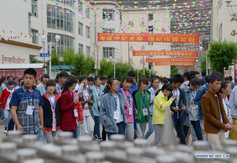 "Gaokao" examinees walk towards an exam site of the national college entrance exam in Qamdo Prefecture, southwest China's Tibet Autonomous Region, June 8, 2014. More than 19,600 examinees in Tibet this year took part in the annual matriculation, which was held on June 7 and June 8. (Xinhua/Wang Shoubao) |