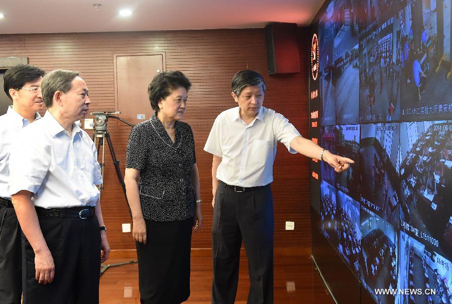 Chinese Vice Premier Liu Yandong (C), also a member of the Political Bureau of the Communist Party of China (CPC) Central Committee, examines a command system for the National College Entrance Exam (NCEE) during an inspection tour at the Test Center of the Ministry of Education in Beijing, capital of China, June 8, 2014. (Xinhua/Liu Jiansheng) |