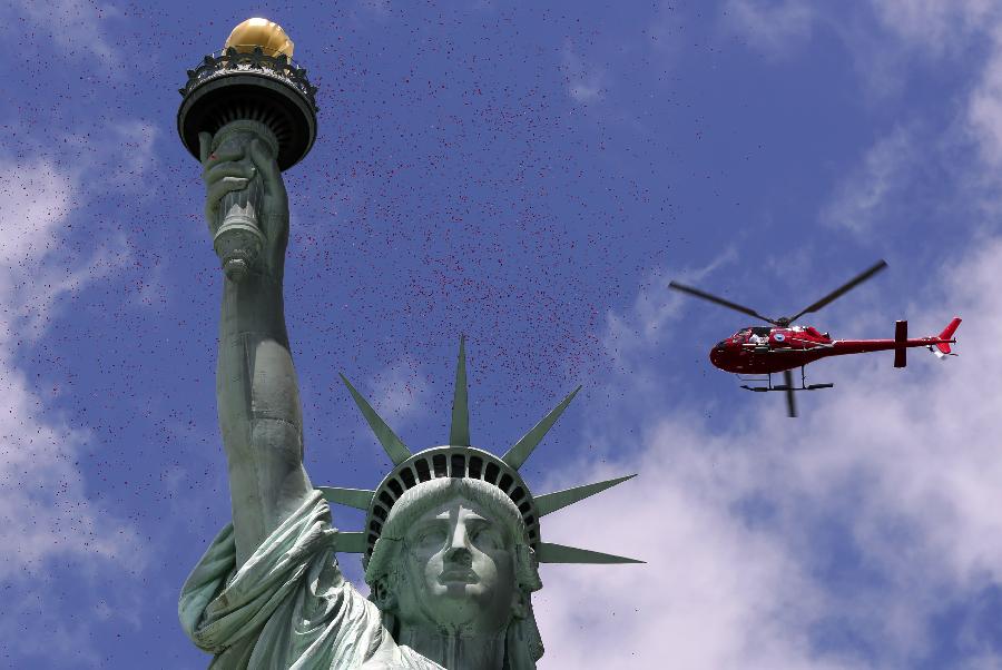 On June 6, helicopters spilled more than one million red rose petals on and around the Statue of Liberty to commemorate the 70th anniversary of D-Day. (Xinhua/AP)