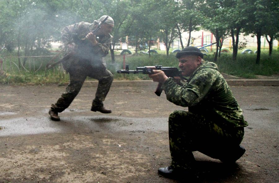 Pro-Russia militants fire at Ukrainian border guards defending the Federal Border Headquarters in Lugansk, eastern Ukraine, on June 2, 2014. (Xinhua/AFP)