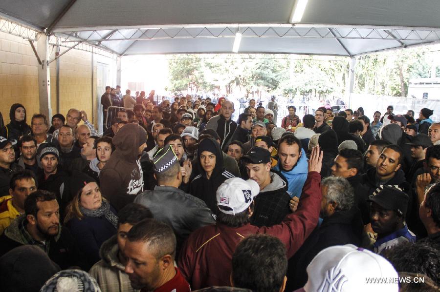 Fans gather at a ticket office of Ibaripuera Gymnasium purchasing tickets for the FIFA World Cup games in the city of Sao Paulo, Brazil, on June 4, 2014. (Xinhua/Marcos de Paula/AGENCIA ESTADO)