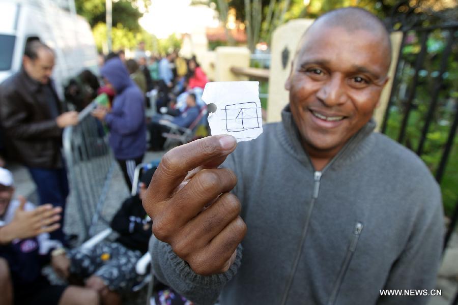 A fan shows a paper with the number one that places him as the first of the row to purchase one of the 180,000 tickets available for the FIFA World Cup games in the ticket office of General Severiano Stadium in the city of Rio de Janeiro, Brazil, on June 4, 2014. (Xinhua/Marcos de Paula/AGENCIA ESTADO) |