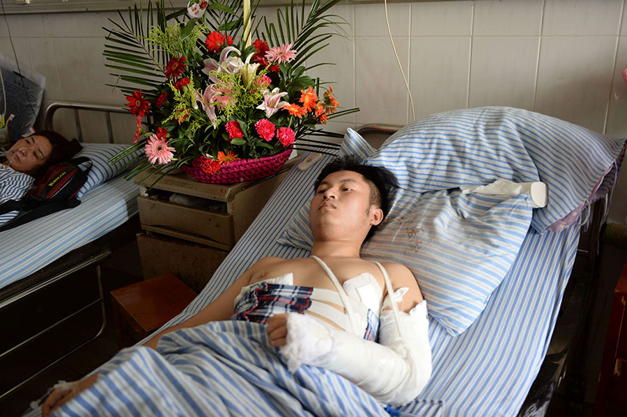 Another injured student Yi Zhengyong lies in bed in the hospital June 7, 2014. (Photo/Xinhua)