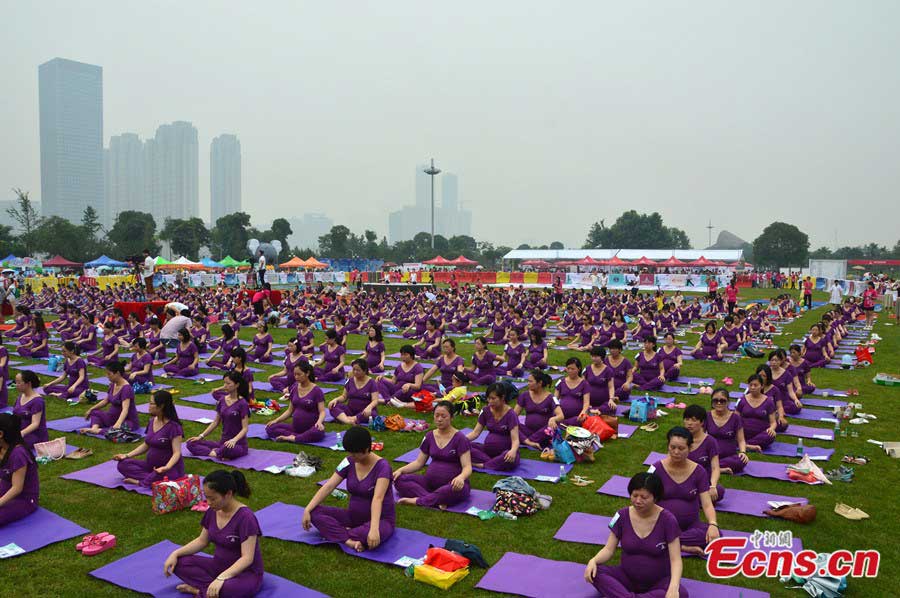 A total of 505 pregnant women set a new Guinness World Record on yoga at a park in Changsha of central China's Hunan province on June 8, 2014. The 505 participants practiced yoga for 37 minutes and 28 seconds, breaking the record in 2013 in Shenzhen which involved 423 pregnant women. According to Guinness certification officer Cheng Dong, to set the new record, all the participants are expected to be over 12 weeks in pregnancy with medical certificates and their challenge lasts no less than 30 minutes. (Photo/China News Service) |