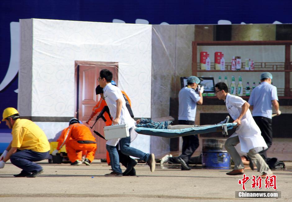 An anti-terrorism drill is held in Yantai, east China's Shandong province on June 5, 2014. The dirll stimulated scenes of explosions, knife attacks and hostage-takings near hotels and schools. SWAT police force, armed police force, fire departments, traffic police, health departments and the power departments joined their efforts to complete exercises including traffic controls, arrests, investigations and detections. (Chinanews.com/Wang Jiaoni)