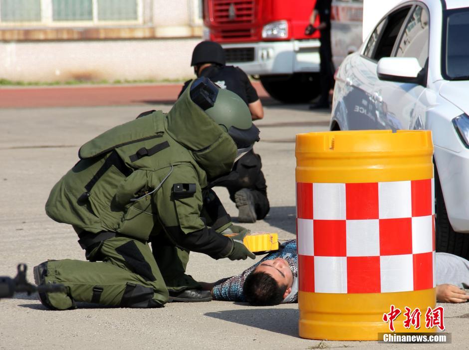 An anti-terrorism drill is held in Yantai, east China's Shandong province on June 5, 2014. The dirll stimulated scenes of explosions, knife attacks and hostage-takings near hotels and schools. SWAT police force, armed police force, fire departments, traffic police, health departments and the power departments joined their efforts to complete exercises including traffic controls, arrests, investigations and detections. (Chinanews.com/Wang Jiaoni)