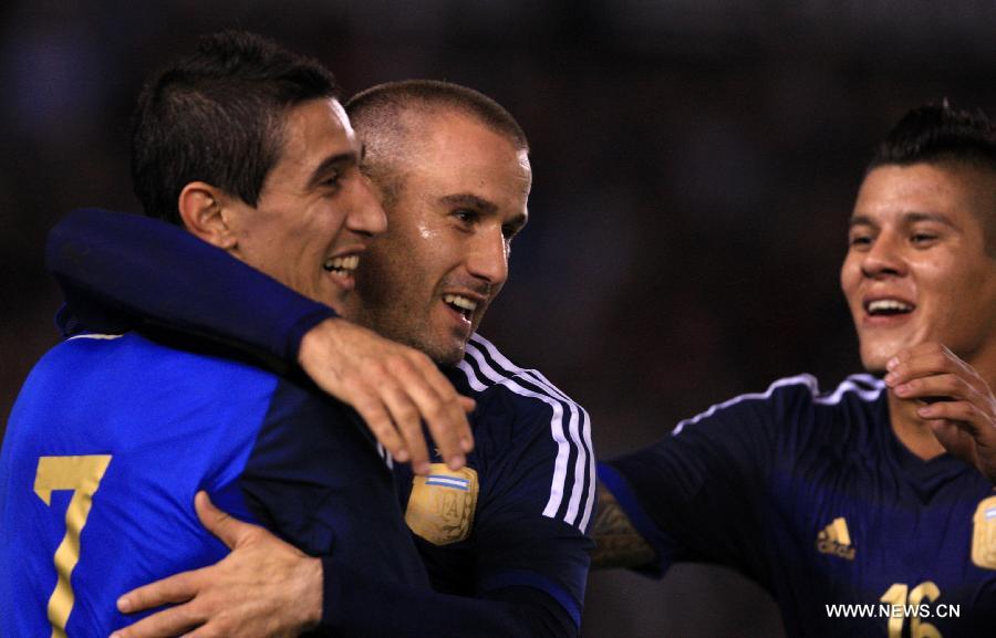 Argentina's Rodrigo Palacio (C) celebrates after scoring, with his teammates Angel Di Maria (L) and Marcos Rojo (R), during a friendly match against Trinidad and Tobago, prior to the 2014 Brazil FIFA World Cup, held at the Monumental Stadium, in Buenos Aires, Argentina, on June 4, 2014. (Xinhua/Martin Zabala) |